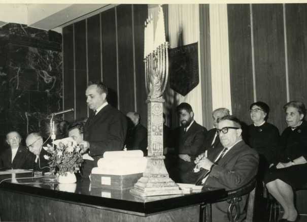 A. C. à la municipalité Au premier plan, de gauche à droite, le président Shazar, caché Teddy Kolek, A Chouraqui et M. Marash (secrétaire de la municipalité). Au second plan, le Rabbin Shar Yachouv Cohen, Ish Shalom, et Mme Ben Zvi.