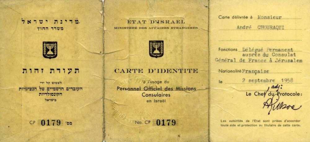 Carte d’identité, 1958. Carte d’identité de service comme délégué permanent de l’Alliance Israélité Universelle.