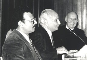 1991 Conférence à la Sorbonne ; de g. à dr. : Mahmoud Azab, A. Chouraqui, le Père Pierre Lambert