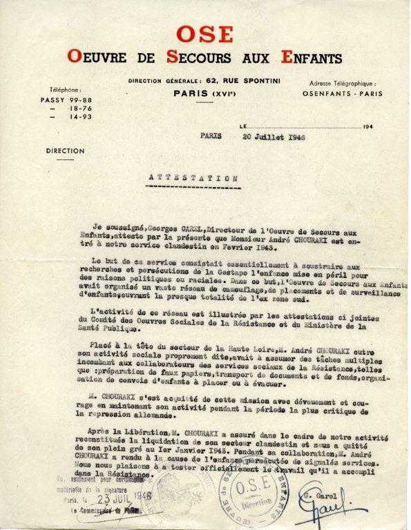 Attestation de l’OSE, 20 juillet 1946. Entré dans le réseau Garel de l’O.S.E. clandestine en février 1943. Directeur du secteur de Haute Loire jusqu’à la fin de la guerre