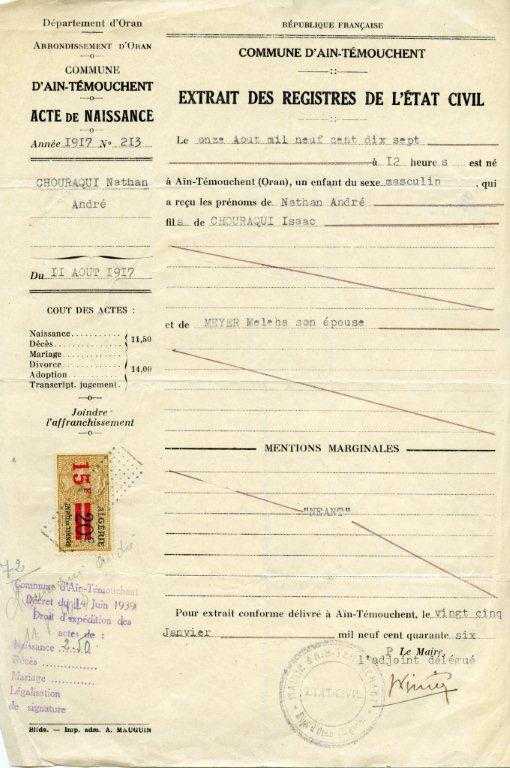 Extrait de naissance, 1917. Samedi 11 août 1917 à 12 heures, naissance à Aïn -Témouchent en Algérie. Le shabbat 18 août, la circoncision est célébrée par le rabbin Shlomo Amar.