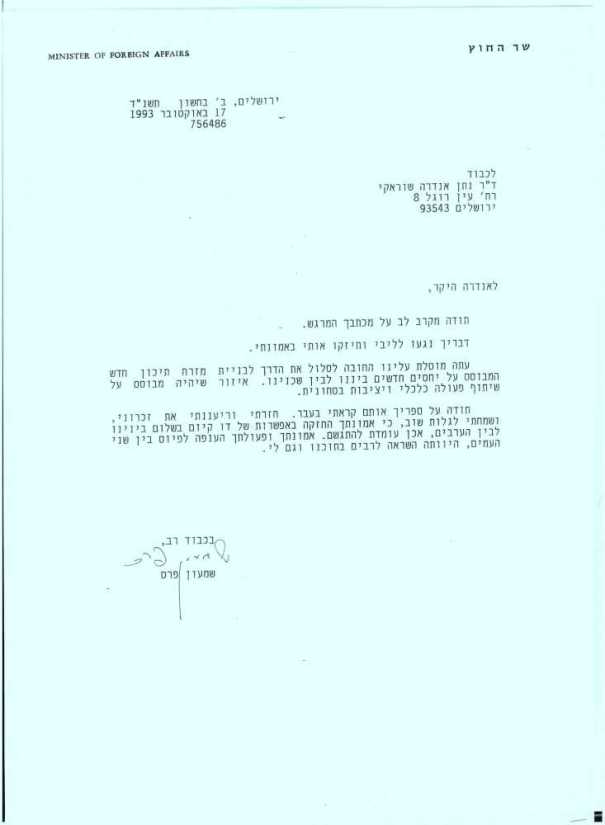 Lettre de Monsieur Pérès Ministre des Affaires Etrangères A André Chouraqui Le ministre des Affaires Etrangères. Jérusalem, le 17 octobre 1993. Mon cher Ami, Merci de tout coeur de votre émouvante lettre de félicitations pour l’événement du 13 septembre 1993. Vos pensées m’ont touché au coeur, elles me confirment dans ma foi en la paix qui vient. Nous avons désormais le devoir de frayer des voies nouvelles pour construire un nouveau Proche-Orient fondé sur des relations pacifiques entre nos voisins et nous-mêmes, dans une région qui devra être édifiée sur une coopération économique et une paix stable. Shimon Pérès
