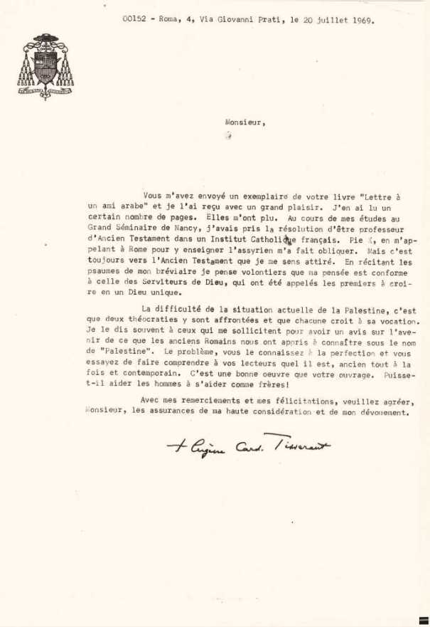 Lettre du Cardinal Tisserand, 20 juillet 1969.