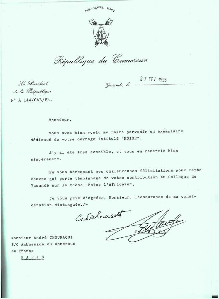 Lettre du Président du Cameroun, Paul Biya, 27 février 1995. Homme politique camerounais, il devint Président du Cameroun en 1982.