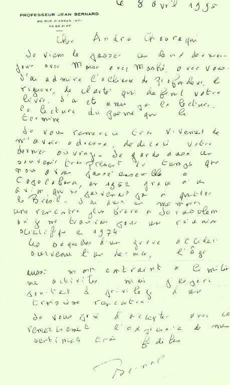 Lettre du Professeur Jean Bernard (1907-2006), 8 avril 1995.