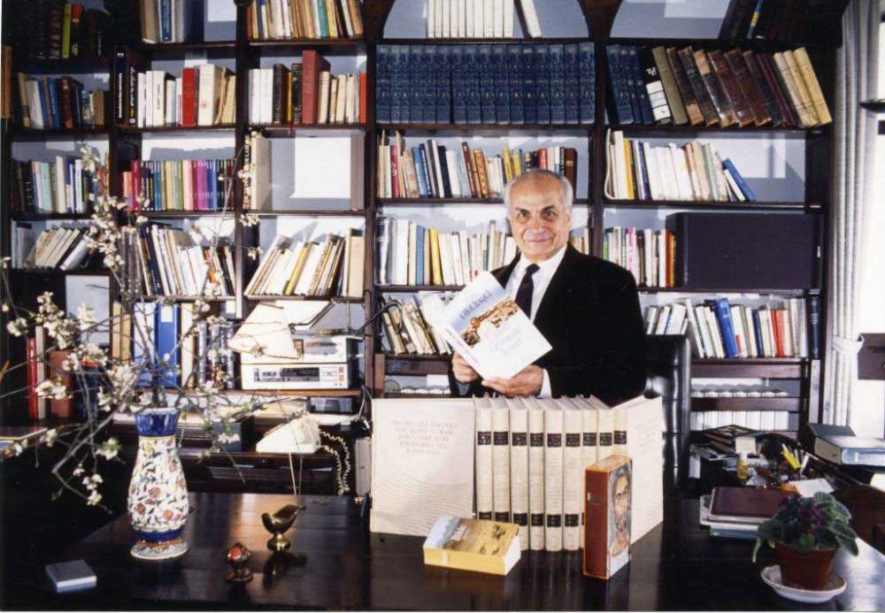A.C dans son bureau. Entouré de quelques-unes de ses principales traductions, l’Univers de la Bible, la Bible ; A. Chouraqui tient dans ses mains, son autobiographie, L’Amour fort comme la mort.