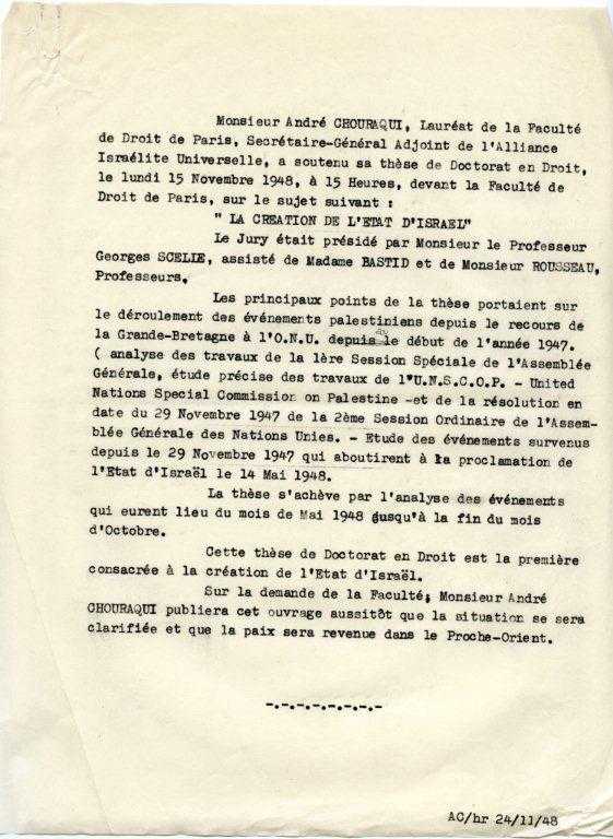 Soutenance de thèse en doctorat de Droit, « La création de l’Etat d’Israël ». En janvier, le titre de sa thèse était : « La création des États palestiniens », (voir archive précédente). Au courant de l’année 1948, les Arabes ayant refusé le partage de la Palestine en deux états, l’un juif et l’autre arabe; fut crée uniquement l’État d’Israël.