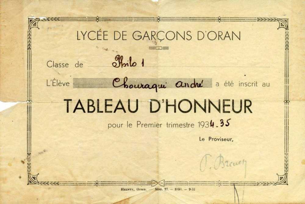 Tableau d_’honneur, classe de philo, lycée Lamoricière, Oran 1934)